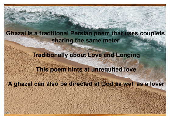 Listen to the ghazal at leisure, but scroll down as you read for my take on the poetry.