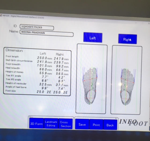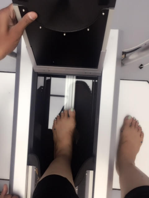 After I filled in my registration form, the laser sensors were pasted at specific points on my feet and the static foot analysis was conducted, one foot at a time.