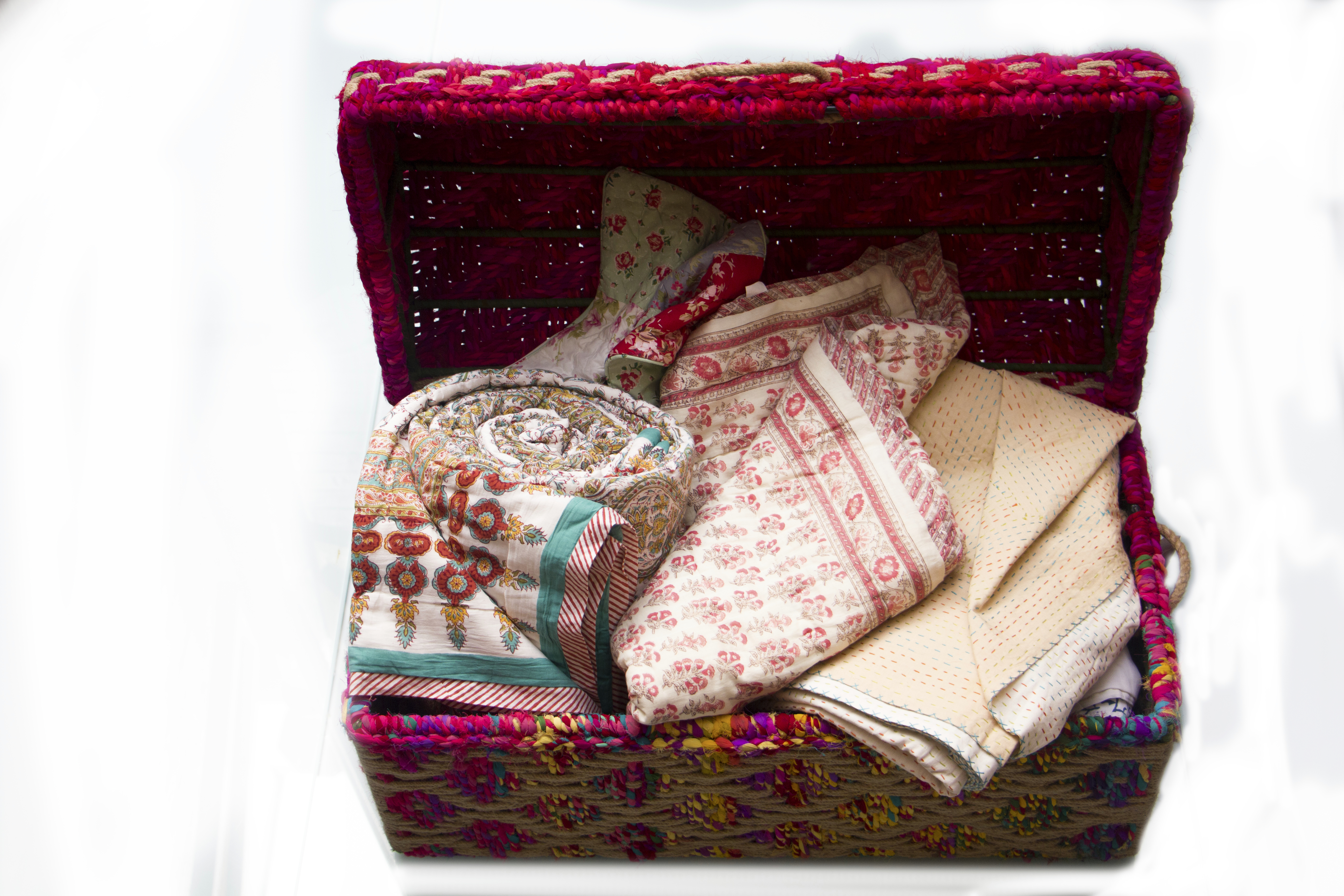 Trunks and a trunk seat for an immediate perk up of any corner of the house.